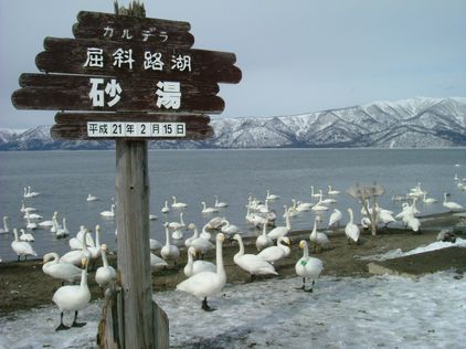 砂湯は、白鳥たちの飛来地で、だいだい12月~3月くらいまで羽を休めているようです。